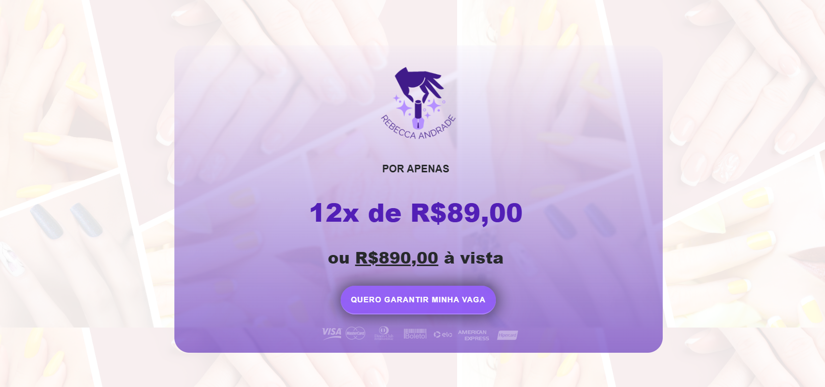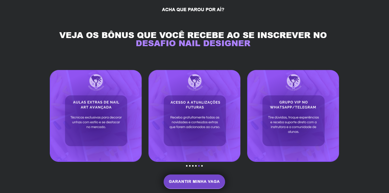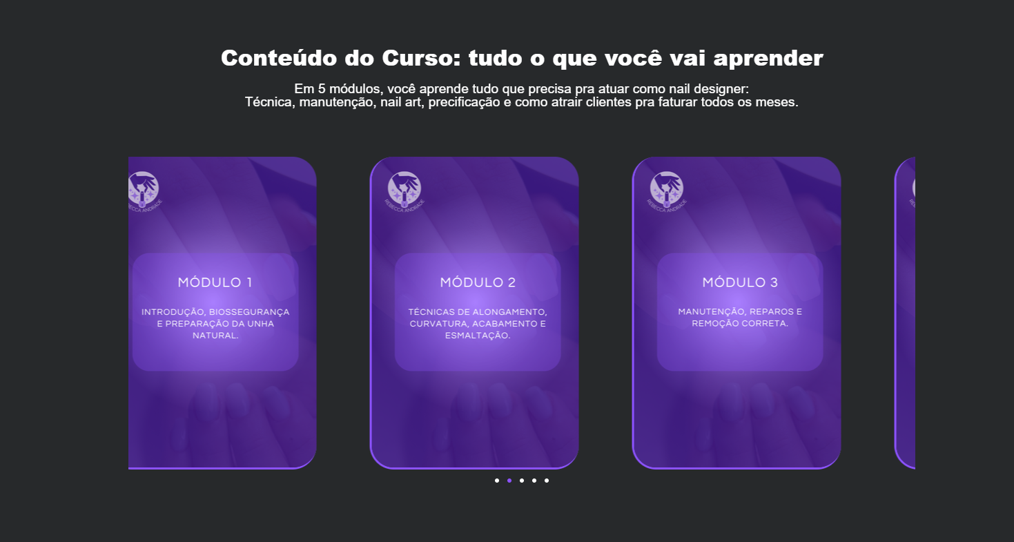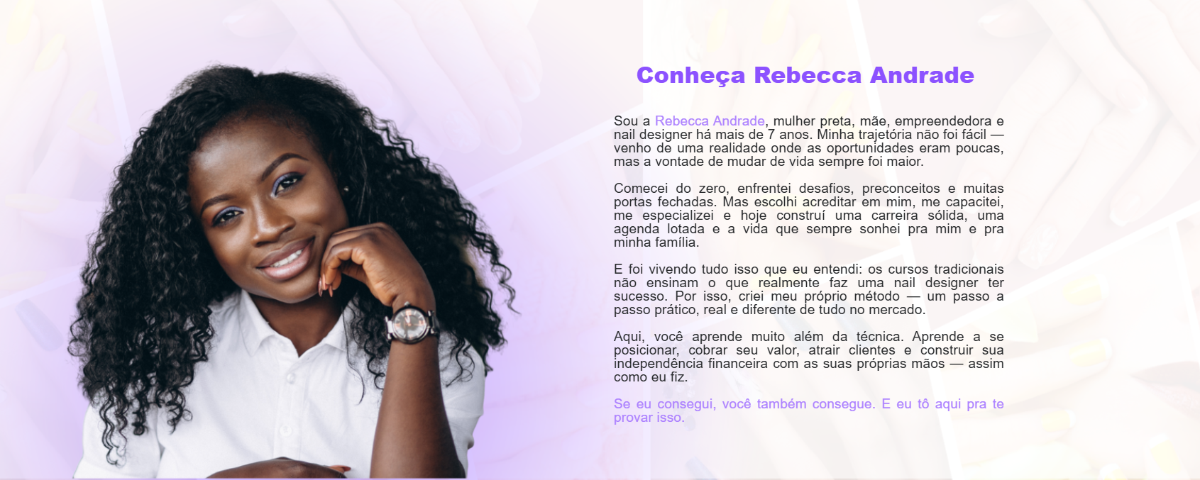 Esse projeto é uma criação acadêmica, desenvolvida como exercício para aprimorar minhas habilidades em design, comunicação e construção de landing pages. A proposta foi imaginar uma página de vendas para o curso da Rebecca Andrade, uma nail designer de sucesso, referência na área.