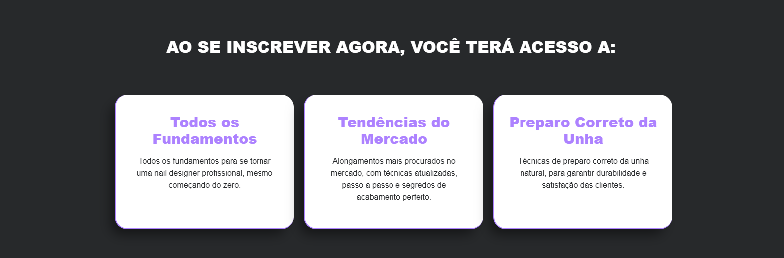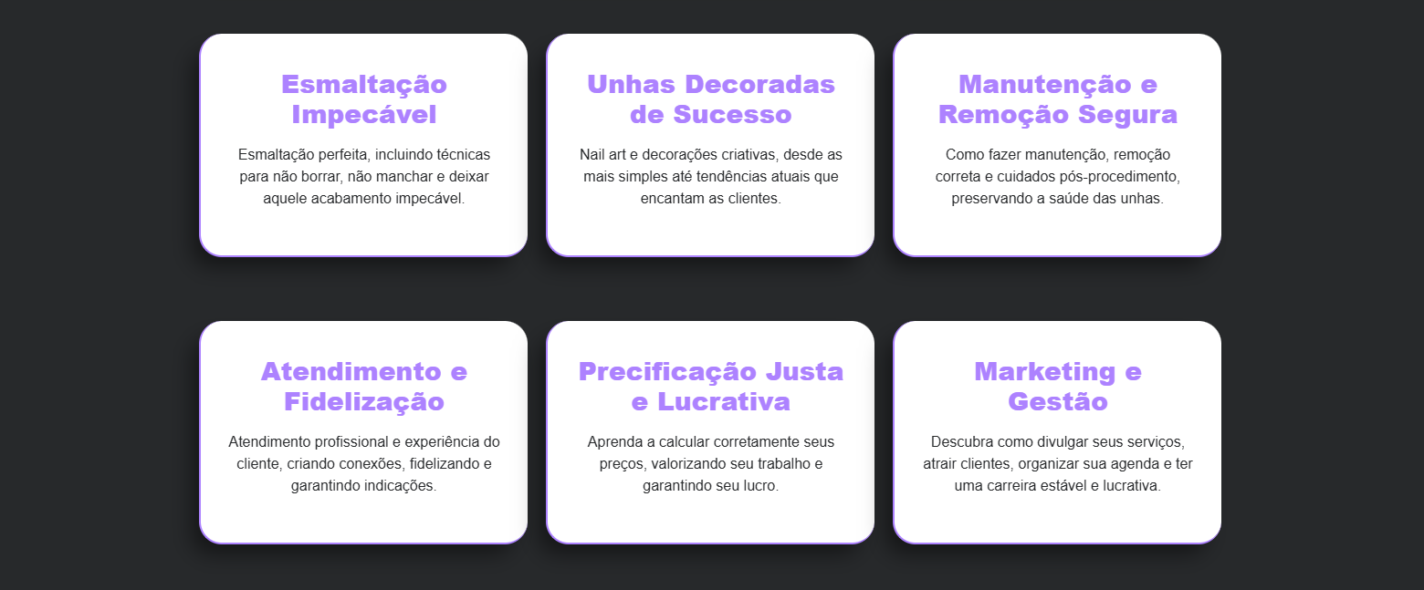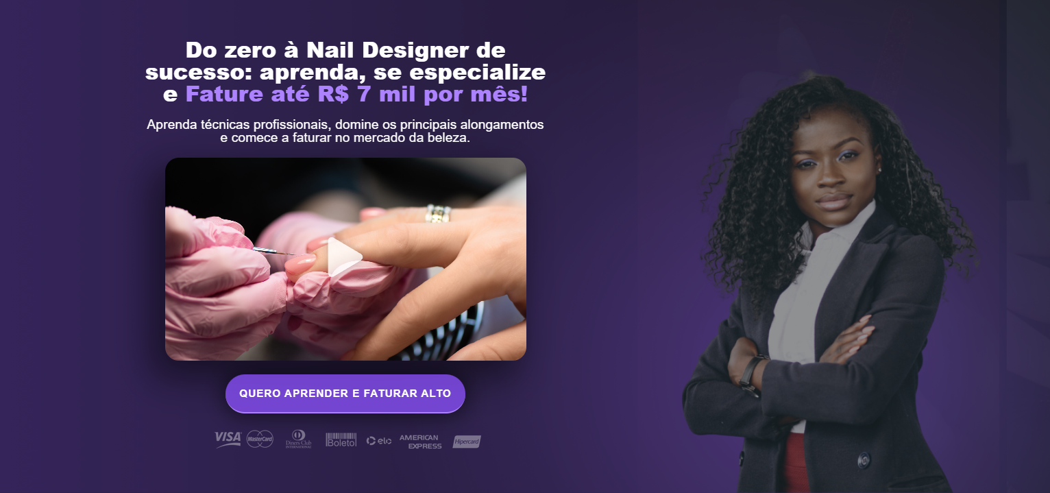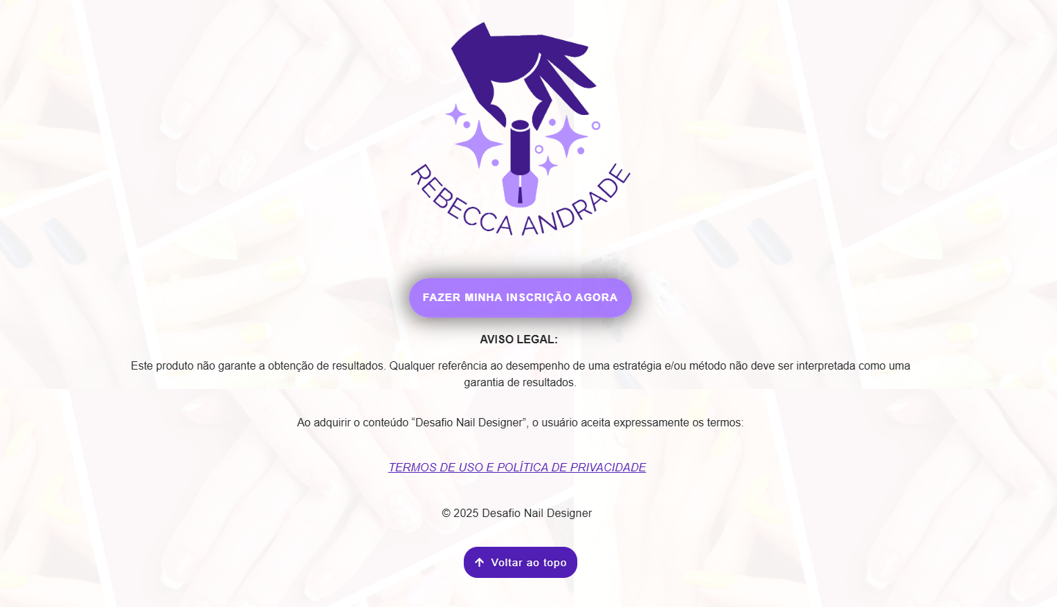 Esse projeto é uma criação acadêmica, desenvolvida como exercício para aprimorar minhas habilidades em design, comunicação e construção de landing pages. A proposta foi imaginar uma página de vendas para o curso da Rebecca Andrade, uma nail designer de sucesso, referência na área.